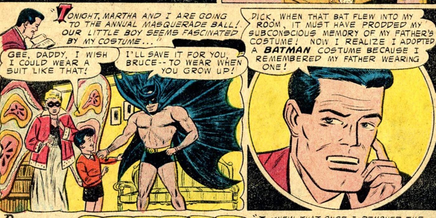 La aparición del murciélago esa noche desencadenó un «recuerdo subconsciente» del primer traje de Batman. Al leer un diario dejado por su padre, Bruce descubre una entrada que dice que el joven Bruce amaba el disfraz y quería llevar uno igual – a lo que su padre respondió diciendo que lo guardaría para su hijo.